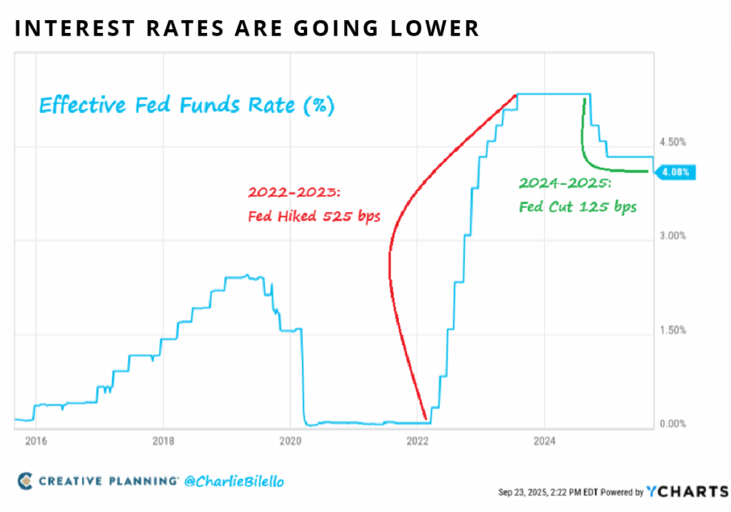 This chart demonstrates that interest rates have started going lower (beginning in 2024), showing how the Fed hiked interest rates 525 bps between 2022 and 2023 but cut interest rates by 125 bps between 2024 and 2025 thus far.