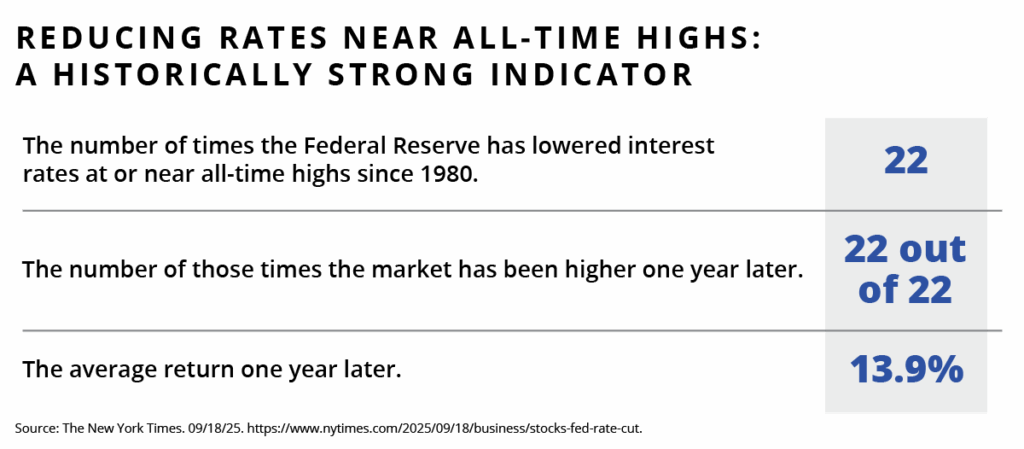 There’s one interesting, and uncommon, dynamic associated with this current round of interest rate reductions worth highlighting. Typically, rate reductions occur when something terrible is happening. Rates were cut in 2020 as COVID set in, in 2008 as the global financial crisis unfolded, in 2000 as the tech bubble burst — and in 1992 as my middle school girlfriend broke up with me! The point is that interest rates are typically declining as the stock market is declining in tandem. As graphed, the Federal Reserve has reduced interest rates 22 times since 1980 when at or near all-time highs (like what’s happening now), and in 100% of these occasions the market has been higher one year later with an above average return of nearly 14%. Could this time be different? Absolutely. But a historical pattern this consistent could largely be viewed as positive.