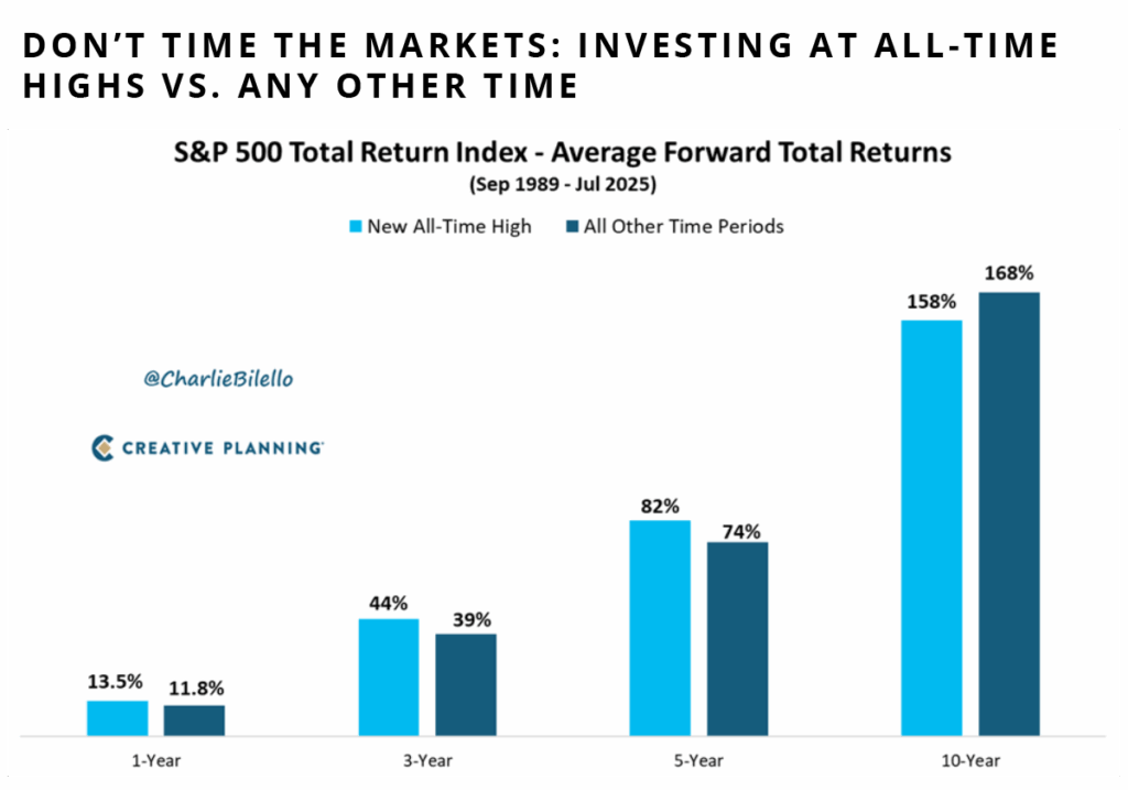 This chart depicts the historical outcomes of the S&P 500 Total Return Index when investing at only all-time highs versus investing at all other time periods (from September 1989 through July 2025). After one year, all-time-high investing is 1.7% higher than investing at all other time periods; at three years, all-time-high investing is 5% higher than investing at all other time periods; at five years, all-time-high investing is 8% higher than investing at all other time periods; and at ten years, all-time-high investing is 10% lower than investing at all other time periods.